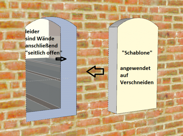 Edit: habe es nochmal versucht und festgestellt, wenn man die gruppierte Schablone nicht rausnimmt sondern de-gruppiert, bleiben die seitlichen Flächen der Schablone "haften", die Mauer ist geschlossen. Die Überstände muss man rauslöschen, dafür auch auf die andere Seite der Wand gehen, temporär Gruppierungen auflösen, ist etwas umständlich. Gibt es noch eine einfachere Methode?