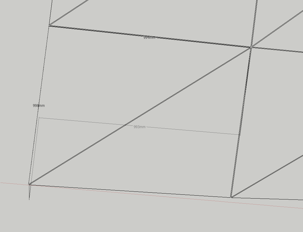 Wenn ich dasselbe in geneigter Ansicht mache, wird die Kantenlänge gemessen - gut so. Aber, das geht bei den Diagonalen nicht. Da wird dann der horizontale Abstand der Endpunkte gemessen, nicht aber die Kantenlänge - siehe Bild.