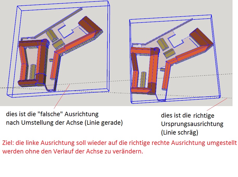 Hallo, vor ein paar Tagen habe ich im Zusammenhang mit der Frage nach der Achsenausrichtung etwas missverstanden und statt dem Modell neue Achsen zu geben, auch die Längsausrichtung des Modells verändert, leider zu spät bemerkt, nachdem weitere zeichnerische Änderungen vorgenommen wurden. Jetzt hat das Modell zwar die gewünschte Längsausrichtung (blauer Kasten, links), aber es steht nicht mehr auf der "richtigen Linie" (der "schrägen", unteren Linie) , siehe Screenshot. Habe dann versucht, mit dem "Drehen-Werkzeug" das Modell auf die richtige (schräge) Linie zu drehen, was aber nicht richtig gelingt, es ist jetzt entweder "überdreht" oder "schief im Raum".