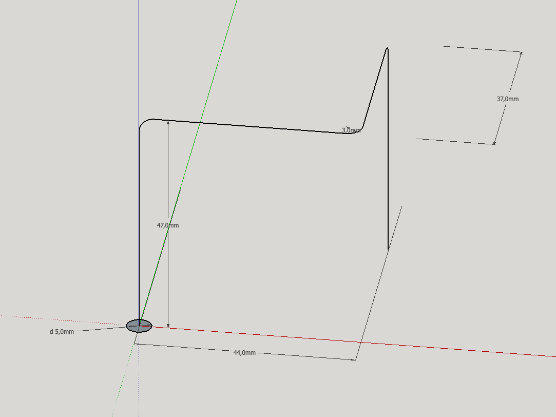Hinweise zu den Proportionen: Rohr Ø = 5 mm, Rohrbiegungen R = 3 mm, Breite 44 mm, Tiefe 37 mm, Höhe 47 mm.