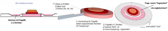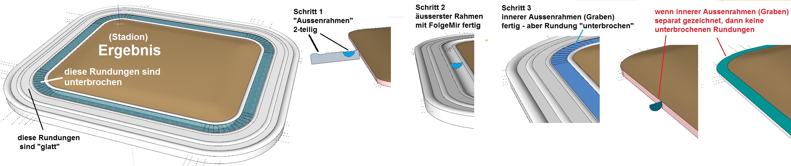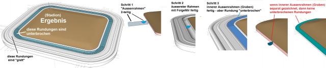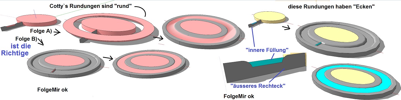 Hallo, habe vor ein paar Tagen dazu schon mal was ähnliches gepostet und dachte das Problem wäre gelöst, ist aber nicht. Wenn ich um eine Elipse (aus Kreis skaliert) mit FolgeMir einen zweigeteilten Rechteck-Pfad zeichne, kriege ich, was den "inneren Teil" betrifft, hinterher einen fragmentierten Kreis bzw. Elipse. Der "äussere Teil" ist ok. Wie das ganze aussehen soll bzw. was bei mir daraus wird, siehe Skizze. Wenn man die Kanten ausblendet, sieht man die Fragmentierung nicht, aber ich möchte die Kanten nicht ausblenden. Ich glaube es liegt daran, dass grössere Kreise oder Elipsen in SketchUp keine echten Rundungen haben sondern aus vielen Ecken bestehen, deren Nahtstellen die Linien der Fragmente bilden - so sieht es jedenfalls aus. Wie krige ich richtige durchgehende Rundungen? Sorry, wenn ich das Thema nochmal poste.