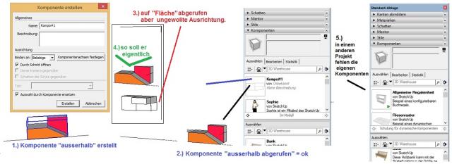 Hallo, ich etwas mit Komponenten probiert; obwohl ich dachte, ich hätte alles verstanden, passiert folgendes: 1.) diverse Komponenten testweise erstellt und zwar auf dem Startdesktop - "ausserhalb eines Körpers oder einer angelegten Fläche". 2.) die Komponenten lassen sich aus der Komponentenablage auch richtig positioniert herausziehen, aber nur wenn das Ziel "ausserhalb einer angelegten Fläche" liegt. 3.) wenn ich dann eine Fläche oder einen Körper anlege, und die Komponente aus der Komponentenablage darauf ziehe, wird die Kompenente "anders gedreht" dargestellt, nicht wie 4.) erwartet. Muss ich die Komponenten immer genau auf der Fläche erstellen, auf der sie hinterher auch benutzt werden sollen?