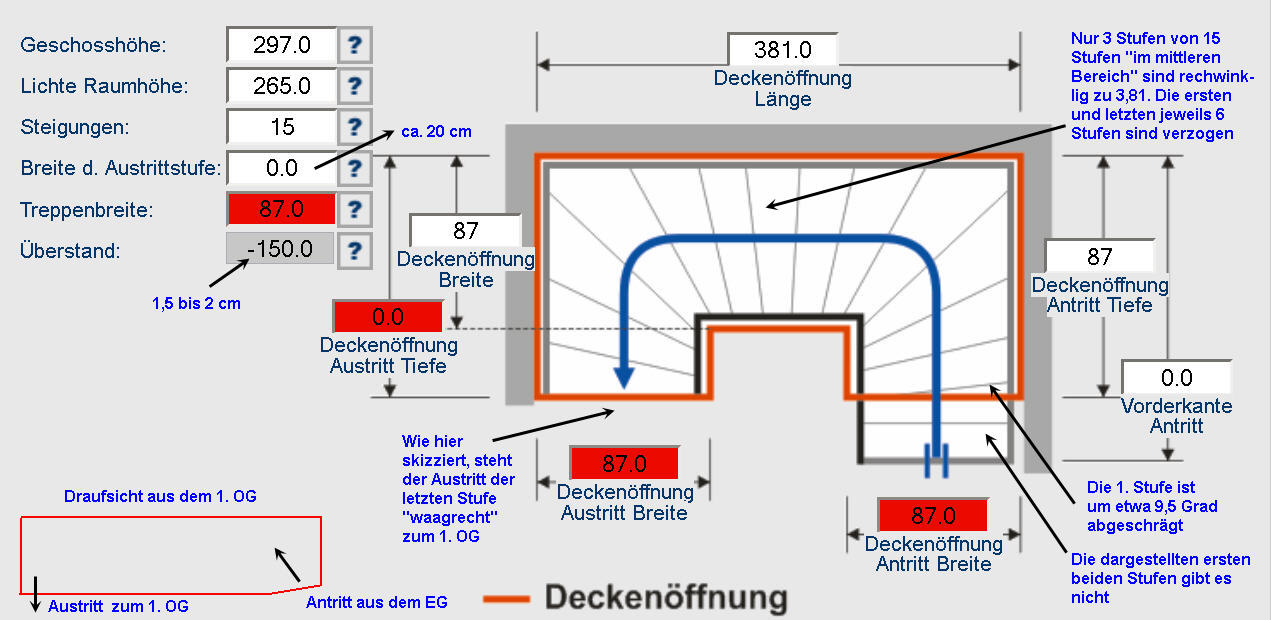 ein bekanntes, aber immer noch nicht befriedigend gelöstes Thema : wie baue ich eine Treppe, 2 x 1/4 gewendelt, davon ein Mal sogar abgeschrägt ? Schaut Euch bitte den Anhang an ! Der Treppenbauer möge mir verzeihen, daß seine Skizze verwendet habe.