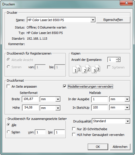 Hinweis: bei kleinen Modellen kann der leere Bereich um das Modell möglicherweise nicht korrekt erkannt werden, sodaß mehr Seiten als benötigt ausgegeben werden. Um dies zu vermeiden, die Option "Modellerweiterungen verwenden" deaktivieren, ein "Kamera > Alles zeigen" ausführen und dann das SketchUp Programm-Fenster manuell sowohl horizontal als auch vertikal bestmöglich auf die Größe des Modells verkleinern. Das Modell muss möglichst formatfüllend angezeigt werden, damit möglichst wenig unnötiger Leerraum in die Berechnung des Druckbereiches einfließt.