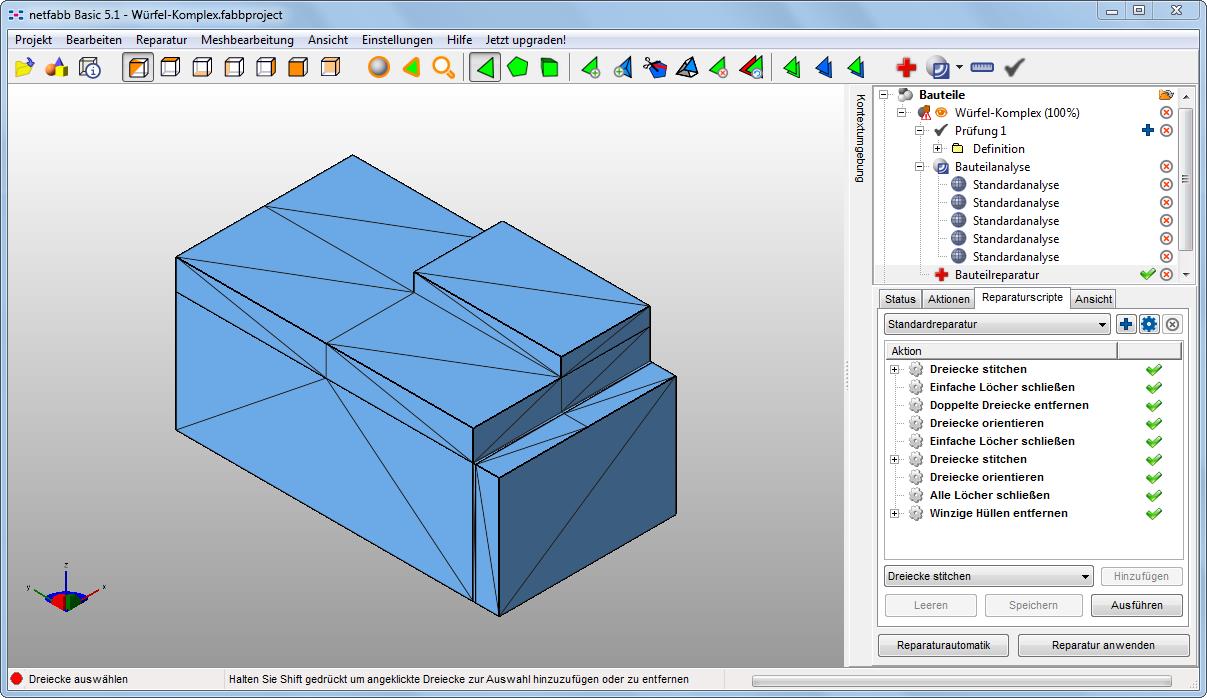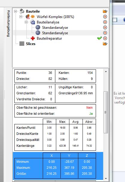 Ausgangspunkt ist ein einfacher Würfel, der nach STL-Export in der netfabb-Analyse auch als fehlerfrei bestätigt wurde (0-Löcher, 0-Grenzlängen usw., Oberfläche geschlossen ...)