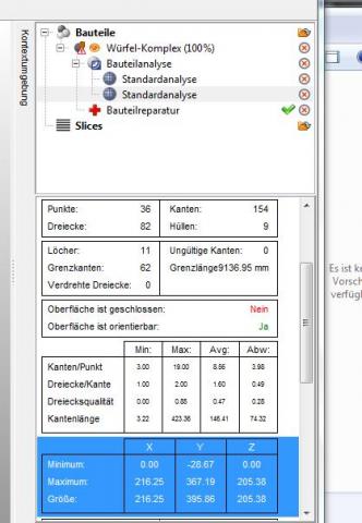Exportiert nach STL und analysiert, zeigen sich Fehler, zunächst 16 Löcher, jede Menge Grenzlängen, Oberfläche NICHT geschlossen ...