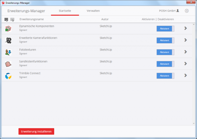 - Mac OS: "SketchUp > Erweiterungs-Manager..."