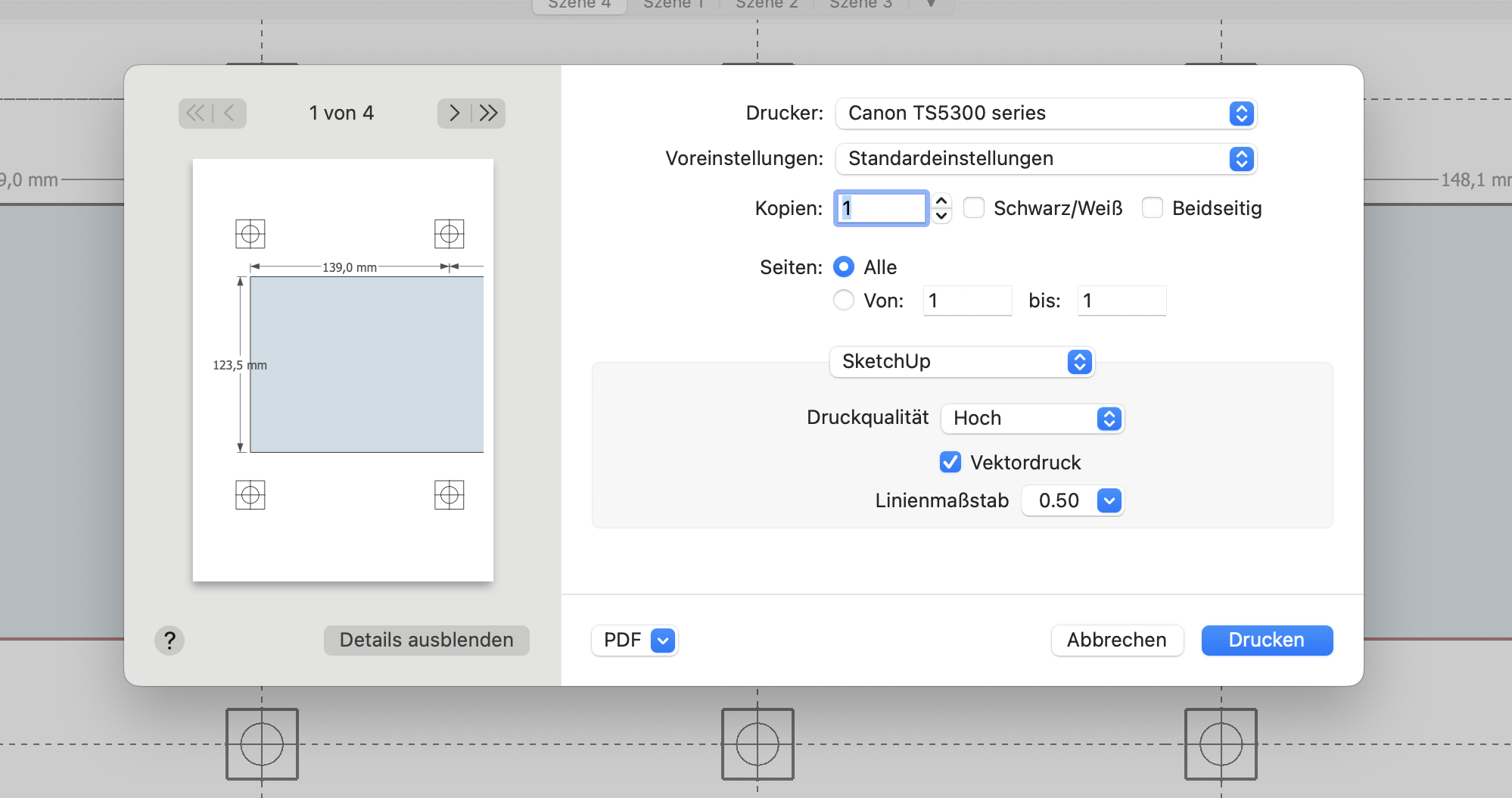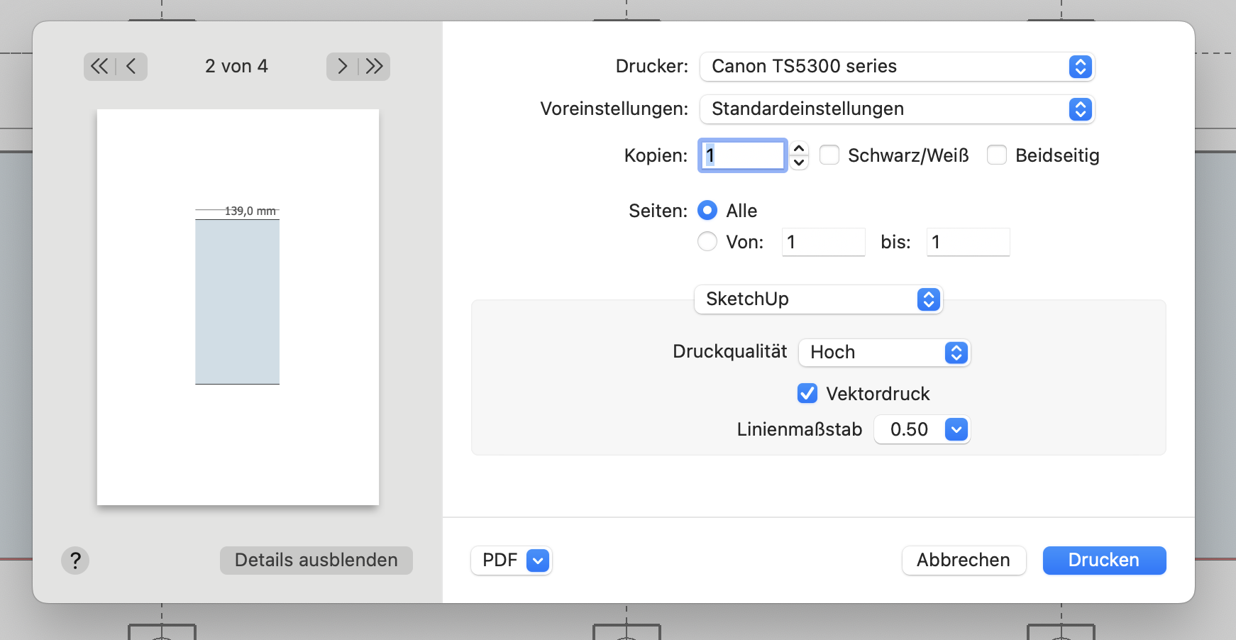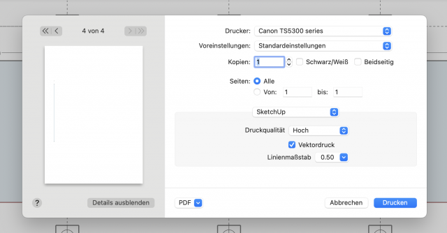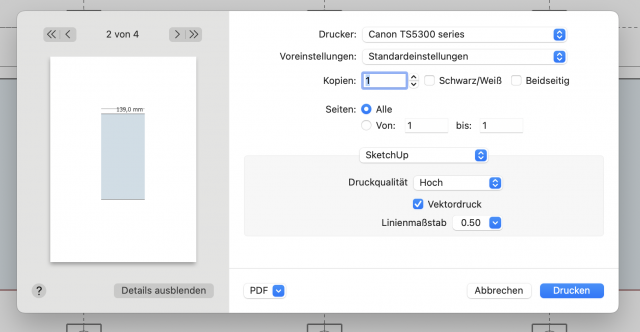 Mit Sketchup habe ich den Querschnitt gezeichnet und kenne jetzt dessen Fläche.