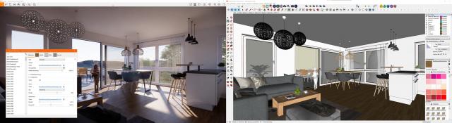 für Renderings nutzte ich bislang Lumion. Kürzlich leistete ich mir ein Enscape-Abo. Das Programm ist dermaßen einfach zu bedienen und macht große Laune. Einer der Unterschiede zu Lumion: Enscape liefert keine Materialien mit, sondern greift direkt die SketchUp-Materialien auf. Um diese dann realistisch(er) abzubilden, wird im Enscape-Menü noch Glanz, Spiegeln und Tiefenwirkung hinzugefügt. Was mir super gefällt ist, dass man die verschiedenen Szenen direkt in SketchUp anlegt, wie üblich. Zudem ist die Liveview-Qualität wirklich großartig. Zum fertig gerenderten Bild gibt es nahezu keine Unterschiede. Unglaublich wie die Technik immer weiter voranschreitet...