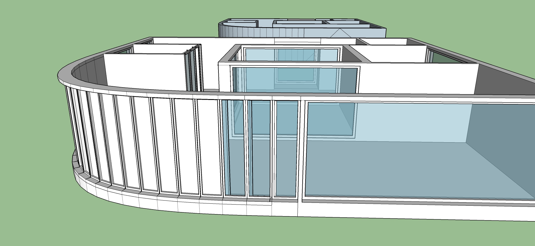 Ich habe ein Gebäude erstellt, welches eine gebogene Fassade hat. In diese Fassade möchte ich nun Fenster setzen. Ich habe sie mit 'Bezier Curves' erstellt und schon in einzelne Flächen unterteilt, damit ich diese geraden Flächen eindrücken kann. Da aber die innere Kurve der Wand kürzer ist als die Außenseite, treffen sich die beiden Seiten nicht. Man sieht also bei den Fensteröffnungen den inneren Rahmen.