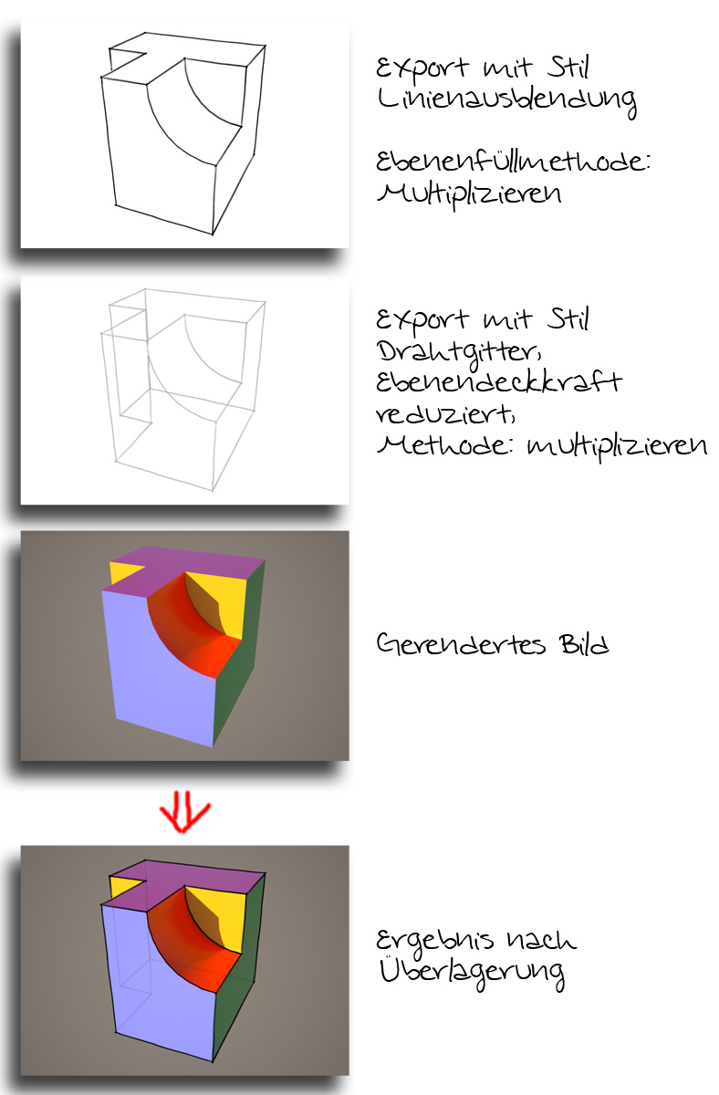 Habe das Plugin von Trogluddite getestet. Toller Ansatz. Nach dem Export lassen sich dann in Photoshop durch Kombination der verschiedenen Ebenen und Einsatz von Filtern sicherlich tolle Effekte erzielen. Werde da mal das eine oder andere ausprobieren. Gerade der Übergang von der Skizze in das Rendering wird mit diesem Pluggin sicherlich einfacher zu realisieren sein.