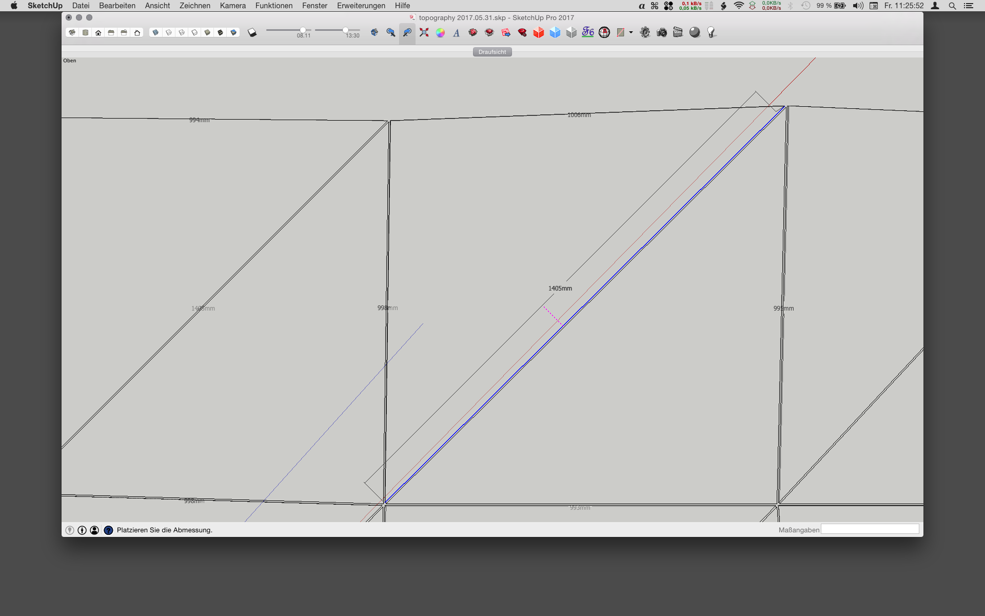 Wenn ich in der Draufsicht mit dem Werkzeug Abmessung über eine Kante gehe, wird die Kante ausgewählt und ein Doppelklikk darauf misst dann die Länge und gibt sie an. Allerdings wird immer die horizontale Strecke gemessen, nicht die Kantenlänge - siehe Bild.