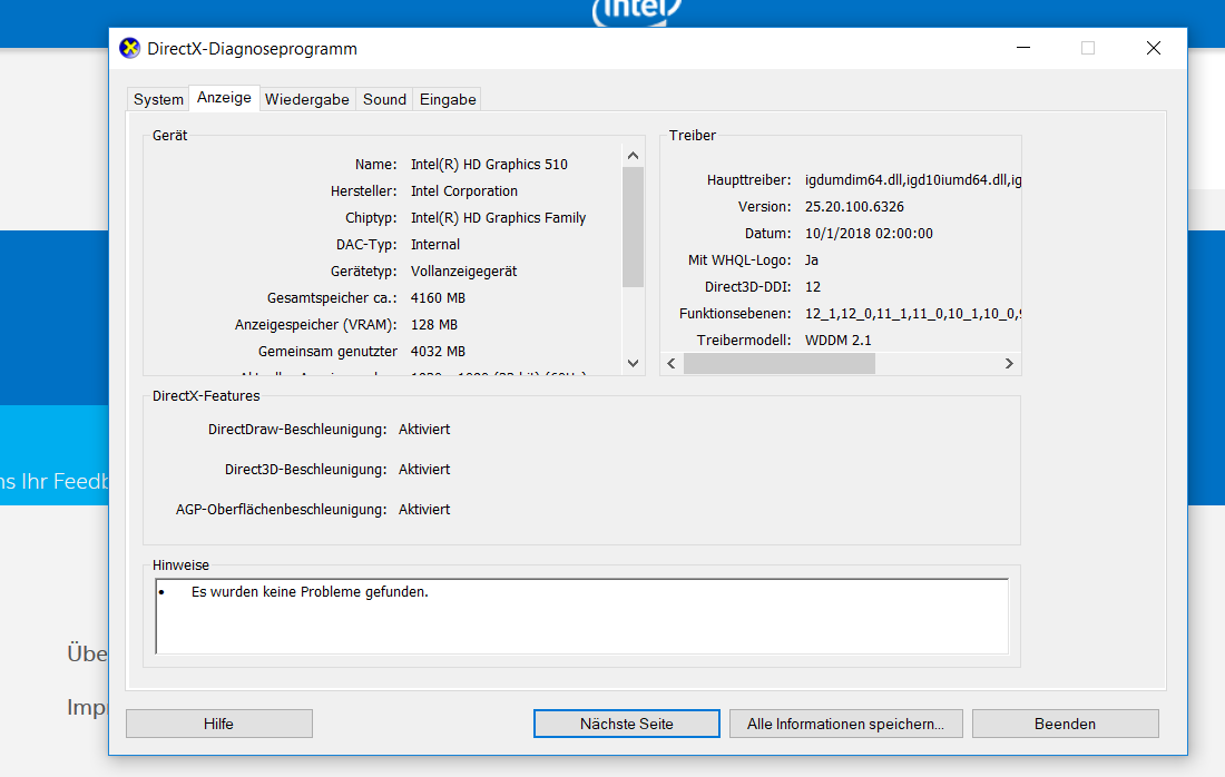 (17.10.2018 - 16:51)ecki123 schrieb: intel HD Graphics 510 den Download des aktuellen Treibers in der Version 25.20.100.6326 vom 09.10.2018 für Windows 10 x64 gibt's auf den intel Support-Seiten. Alternativ kann man für eine automatische Erkennung und Installation aktueller Treiber usw. auch den 'intel Treiber- und Support-Assistenten' verwenden. Norbert