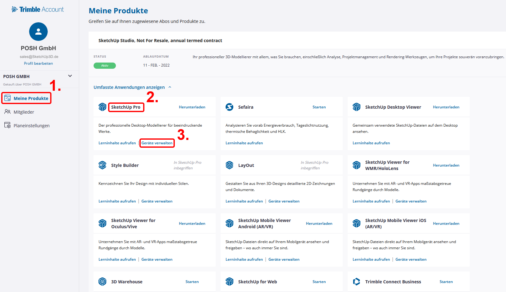 Um Probleme mit der Anzahl der Aktivierungen zu beheben, im Trimble Account Management Portal per "Meine Produkte > Umfasste Anwendungen anzeigen > SketchUp Pro > Geräte verwalten > …" alle bestehenden Produkt-Aktivierungen aufheben.