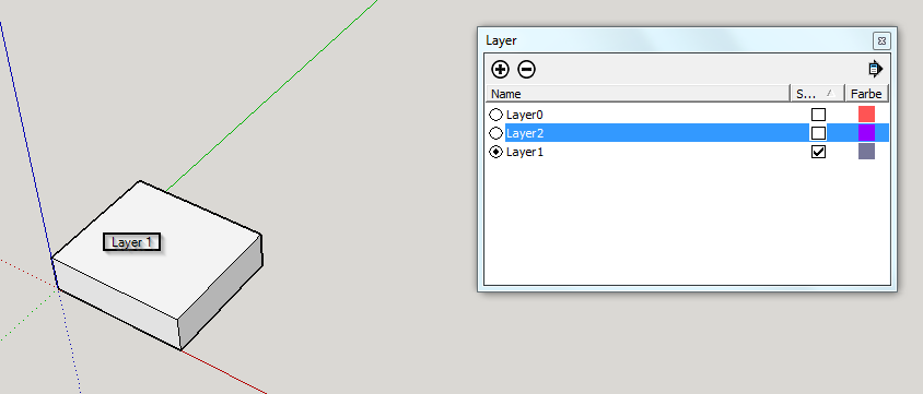 Layer dienen in SU - anders als in CAD-Systemen - nur der Steuerung der Sichtbarkeit von Objekten und nicht zur Strukturierung des Modells. Die auf ausgeblendeten Layern liegende Geometrie interagiert weiterhin mit den sichtbaren Elementen, eine Modifikation des sichtbaren Modells kann also im schlimmsten Fall zu 'Schäden' bei den ausgeblendeten Objekten führen.