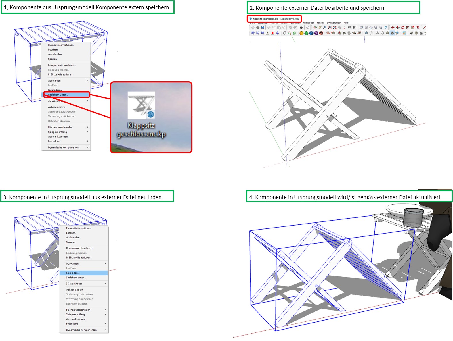 Komponenten tauschen: Neue Komponenten-Version in Gesamtmodell importieren >"alte" Komponente anwählen >Innerhalb der Standard-Ablage >Komponenten >Im Modell >neue Komponentenversion anwählen >in Untermenü (rechte Maustaste) Auswahl ersetzen klicken >>>> (SketchUp Quick Tips - Quickly Swap Components)