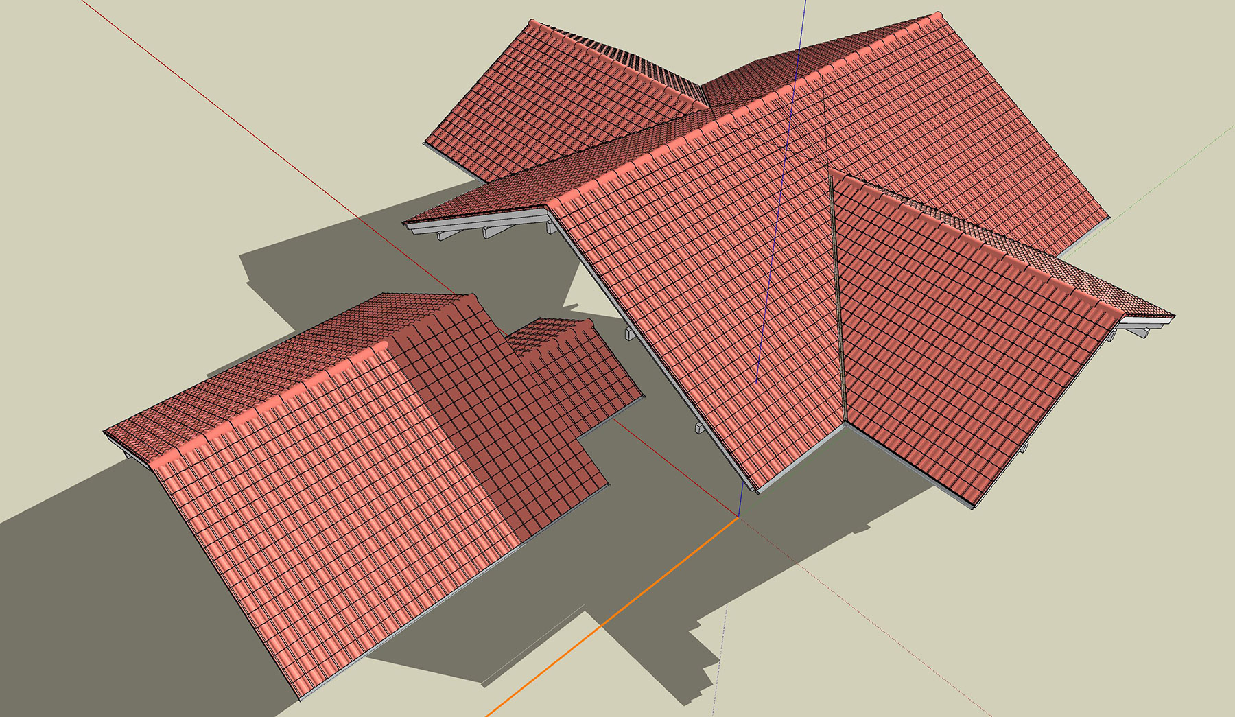 Danke Jörg. Das Ganze wird ein Einfamilienhaus. Glücklicherweise sind die beiden Querbauten spiegelbildlich. Macht Fun das so zu zeichnen, aber ist natürlich recht aufwändig mit den ganzen Dachziegeln. Aber für die Visualisierung wollte ich das diesmal so machen. Eine einfache Ziegeltextur sieht immer recht billig aus.