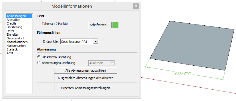 unter "Modellinformationen" gibt es den Punkt "Abmessungen"! Hier kannst du einige Sachen an der Bemaßung ändern z.B. Schriftart und Größe. Aber wie gesagt, sketchup ist ein 3d-Programm. Ewas mehr geht da mit dem Zusatzprogramm "Layout" der Pro-Version!