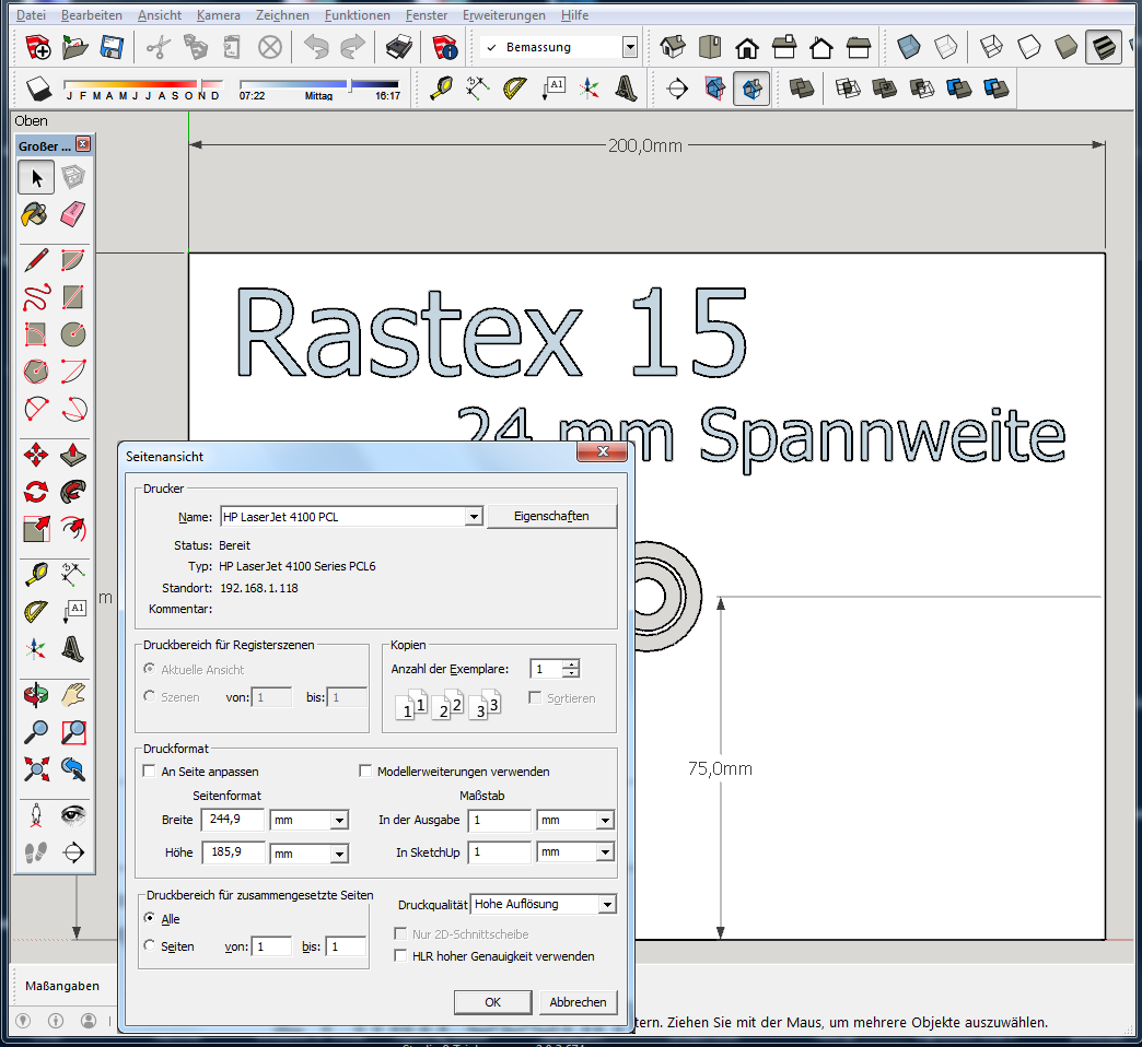 es geht wiegeschrieben nicht darum, die Einstellungen genau so einzustellen wie ich, was aufgrund unterschiedlicher Randbereiche des Druckers/-treibers sowieso nicht möglich ist, sondern darum, das SketchUp Programm-Fenster soweit zusammen zu schieben, dass möglichst wenig Freiraum um das Modell angezeigt wird (s.o.).