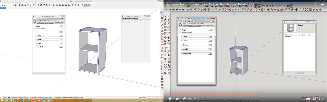 Jetzt kann man im Screenshot sehen, dass die Komponente markiert ist, aber im Dialogfeld „Komponentenoptionen“ diese nicht gezeigt wird. in dem Video rechts ist mit dem Anklicken des Modelles dieses auch in den Komponentenoptionen zu sehen.