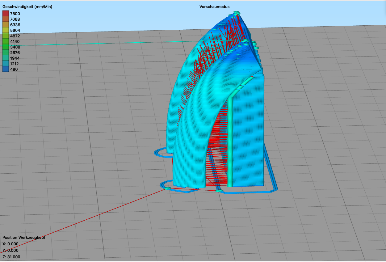 Ich konnte das Teil nur senkrecht drucken, weil da die einzigen graden Auflageflächen sind. Die Fläche ist recht klein und so brauchte es zum drucken viele Stützungen wegen des gebogen Körper. Auch soll das Teil auf dem Druckbett halten. Meine Werkstatt ist ungeheizt. Ich habe den Drucker mit geschlossenem Druckraum 20 Minuten vorgeheizt. Dann ABS mit 110° Betttemperatur und 245° Nozzletemperatur im geschlossenen Druckraum gedruckt. Nach dem Erkalten lag das Teil lose auf dem Druckbett. So, wie es sein soll.