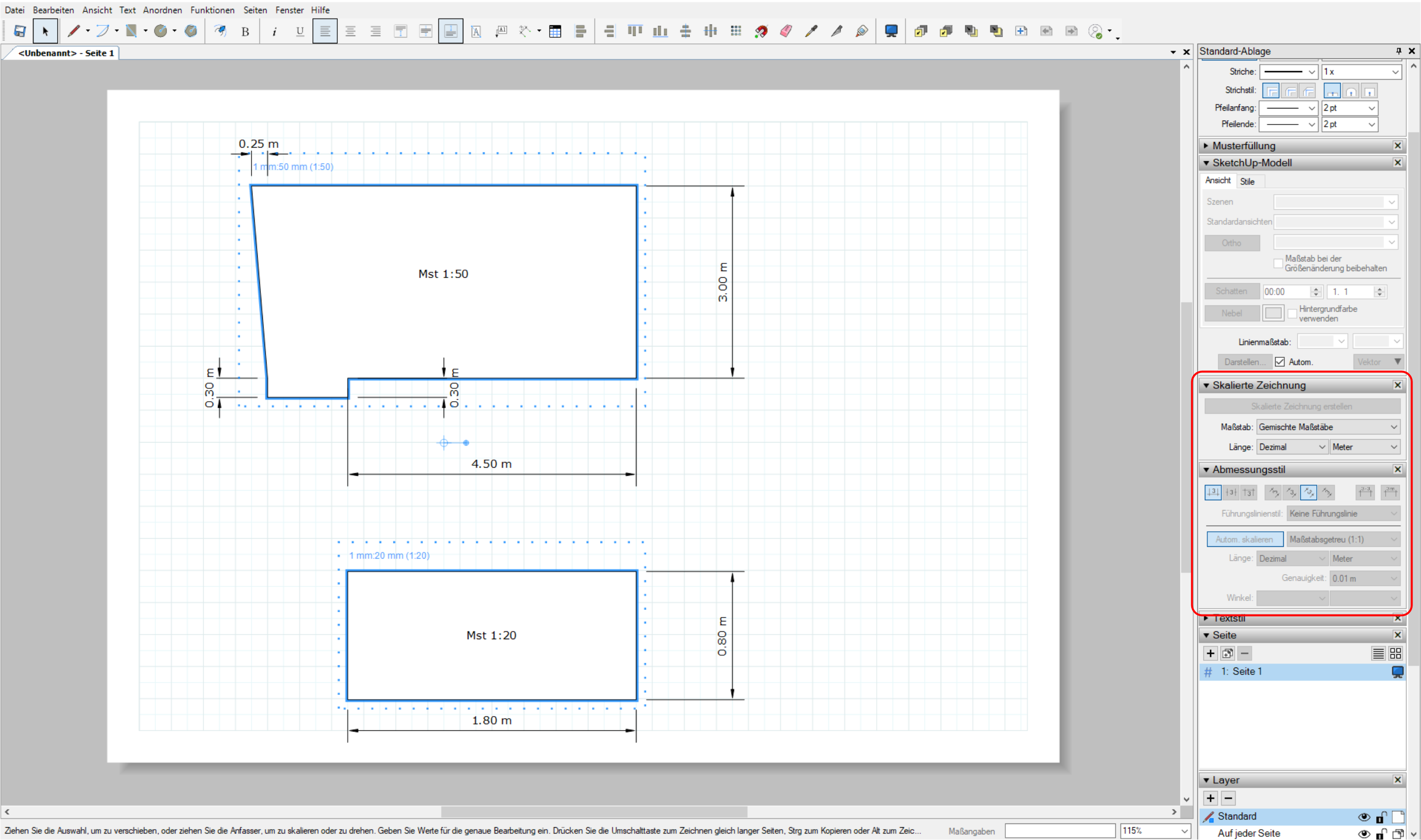 Wenn ich jedoch in Layout direkt zeichnen will, ohne import von SketchUp, kann ich keinen Maßstab einstellen. Das Menü dazu ist hellgrau und nicht anwählbar.