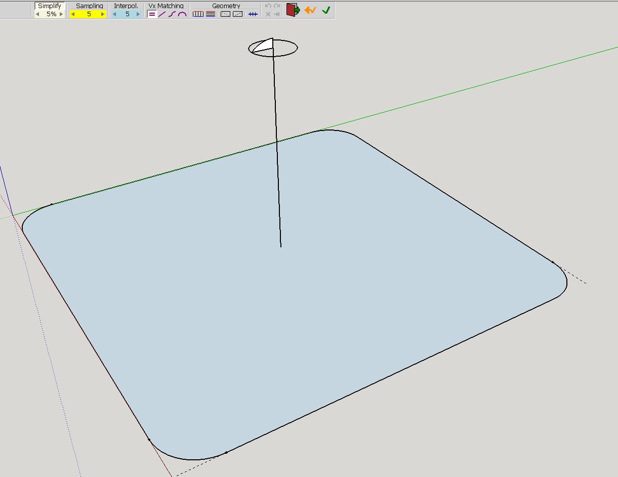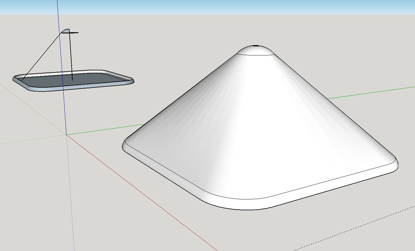 ich habe das Problem, dass ich gerne eine Pyramide mit vollständig abgerundeten Ecken erstellen würde. Solange ich in 2D bleibe, bekomme ich es mit den Bogensegmenten hin. Aber wenn ich das dann als "Pyramide" umsetzen möchte, dann scheitere ich am FollowMe Tool. Ich zeichne ein Face mit dem Querschnitt, der mir auch von den Kurvenradien gefällt (siehe Bild 1) und versuche, das dann über das FollowMe Tool an der Außenkante entlangzuziehen. Aber dadurch, dass SketchUp 2014 Make (aktuellste Version) das Face nicht streckt bzw. staucht, kommt das Ergebnis aus Bild 2 heraus.