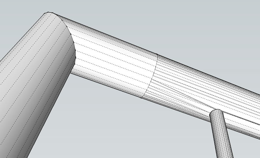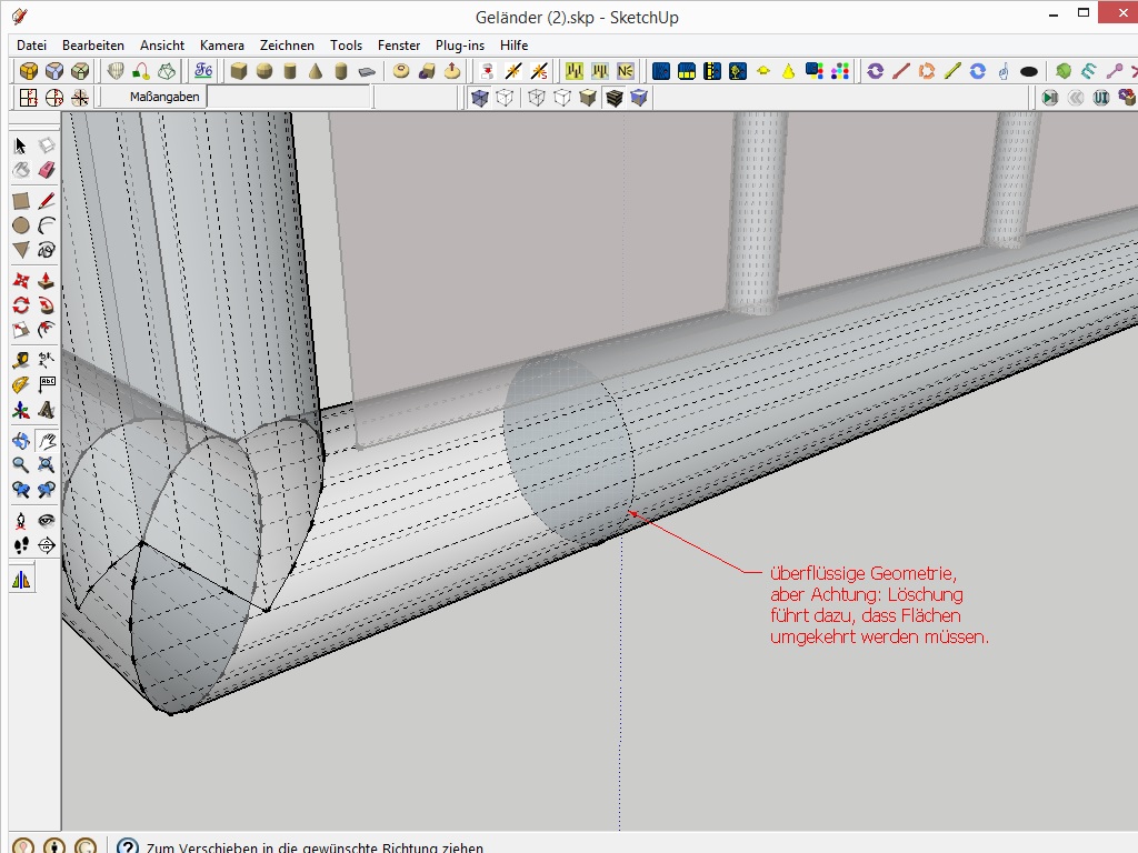 mit meinen Kenntnissen ist es mir noch nicht gelungen die mittleren Rohre auf einfache Weise "einzuschweißen". In meiner Beispieldatei habe ich irgendwo (nicht am Ende) an der senkrechten Linie einen Kreis mit dem Rohrdurchmesser angefügt und mit der Funktion "Folge mir" zum Rohr erweitert. Die Farbe des Rohres passt zu dem Gesamtrahmen aber die Rohrenden sind nicht mit dem Rahmen verschnitten und können auch nicht verschnitten werden. Als nächste habe ich mit der Funktion "Drücken/Ziehen" den Kreis nach oben und nach unten zu einem Rohr erweitert und in den Gesamtrahmen eingefügt. Mein Problem dabei ist exakt die Mitte des Gesamtrahmenrohres zu treffen, auch stört mich die weiße Farbe des so erstellten Rohres. Verschneiden kann man das so eingefügte Rohr. Die unansehnlichen Schnittkanten habe ich umständlich ausgeblendet. Sicherlich geht das Ganze auch eleganter. Wenn ich erst mal weiß wie man das Rohr und die Rundstäbe optimal "anfügt" möchte ich das Geländer wie von cotty empfohlen aufbauen. Gruß Ich Bins (19.05.2015 - 09:38)Ich Bins schrieb: Hallo Mühlbauer, Das interessiert aber nur dann wirklich, wenn z.B. 3D-Druck geplant ist. Damit sich die Rohre schön schlüssig verbinden sollte es genügen, das Rohr nach oben (siehe Bild) und unten um den Halbmesser des Rohres zu verlängern. So ab 2-3 mm Rohrdurchmesser lässt sich sowas im Modell per 3D-Druck so schön realisieren, wie das früher nur ein Lötmeister konnte.