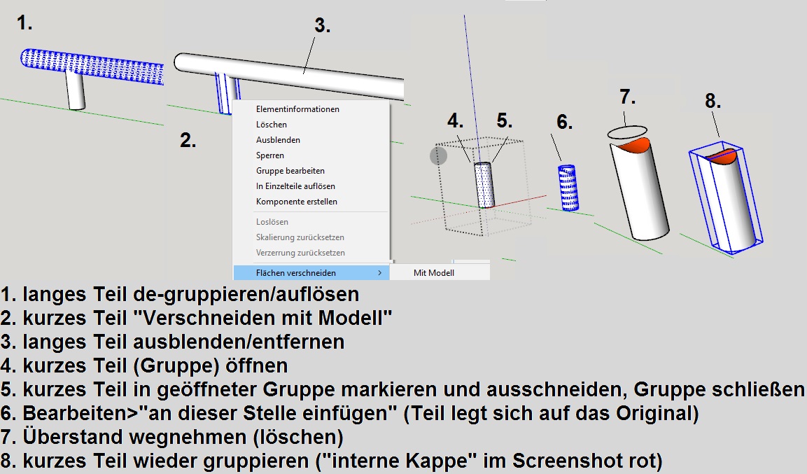 In dem obigen Falle wird zunächst das Verschneiden mit de-gruppiertem langen Teil durchgeführt, beim anschließenden Wegblenden des langen Teiles bleibt daraus nur die für das kurze Teil vorgesehene "Muldenklappe" (im Screenshot Rot) bestehen, sie muss jetzt nur noch mit dem kurzen Teil verbunden werden. Durch das Öffnen der "Gruppe" des kurzen Teiles und dann "Auschneiden" innerhalb der Gruppe, wird das kurze Teil nicht gelöscht, sondern nur "versteckt". Dann muss die Gruppe geschlossen werden. Jetzt wird das "versteckte" Teil wieder per "Einfügen an dieser Stelle" an seine vorherige Position (aber jetzt ausserhalb der Gruppe) positioniert und zwar direkt "auf" die dort wartende verschnittene "Muldenklappe". Man muss nur noch die ungewollten Konturen des kurzen Teiles entfernen (mit z.B. Radiergummi), damit die darunter liegende Muldenklappe sichtbar wird. Anschließend kurzes Teil mit Muldenklappe zusammen gruppieren. So läuft es...besser kann ich es leider nicht erklären.