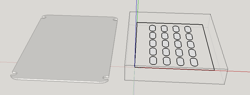 - Das Z-fighting genannte Phänomen bei den ovalen Formen deutet darauf hin, dass hier zwei Flächen an der gleichen örtlichen Position vorhanden sind. Wenn möglich, sollte dies verhindert werden. Wenn dies später Löcher werden sollen, könnten die Komponenten (320 im Modell vorhanden, mehrfach an gleicher Stelle) aufgelöst und die Flächen in die Grundfläche integriert werden.