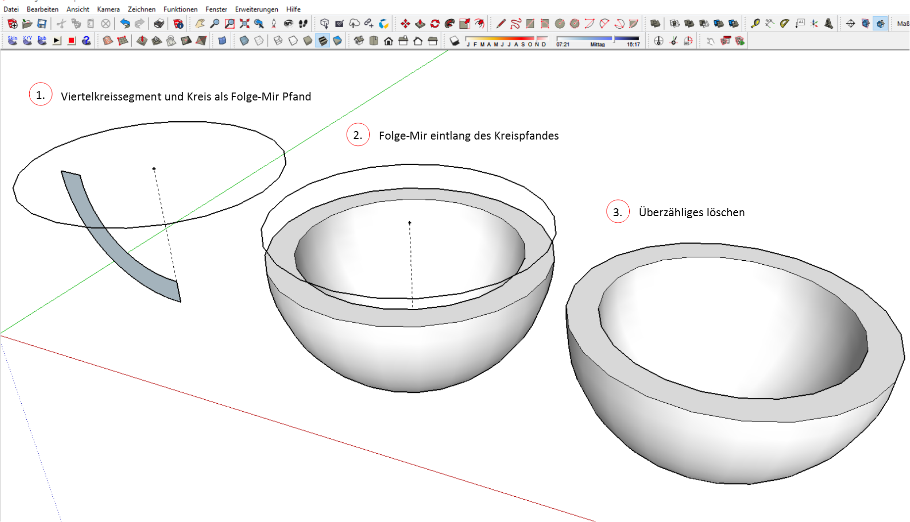 Wenn es nur die Halbkugel sein soll, kann diese auch mit dem «Folge-Mir» Werkzeug auf der Basis eines Viertelkreis-Segmentes erzeugt werden.