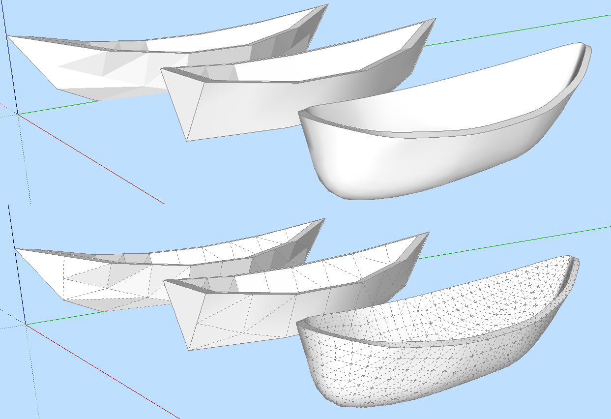 Für einen glatten Verlauf sollten die Kanten sowohl abgemildert als auch geglättet werden (Boot Mitte). Vorne eine Version, die ich mit dem (Kostenpflichtigen) Plugin Artisan verfeinert habe. Insgesamt wird durch etwas feinere Geometrie die glatte Ansicht besser.