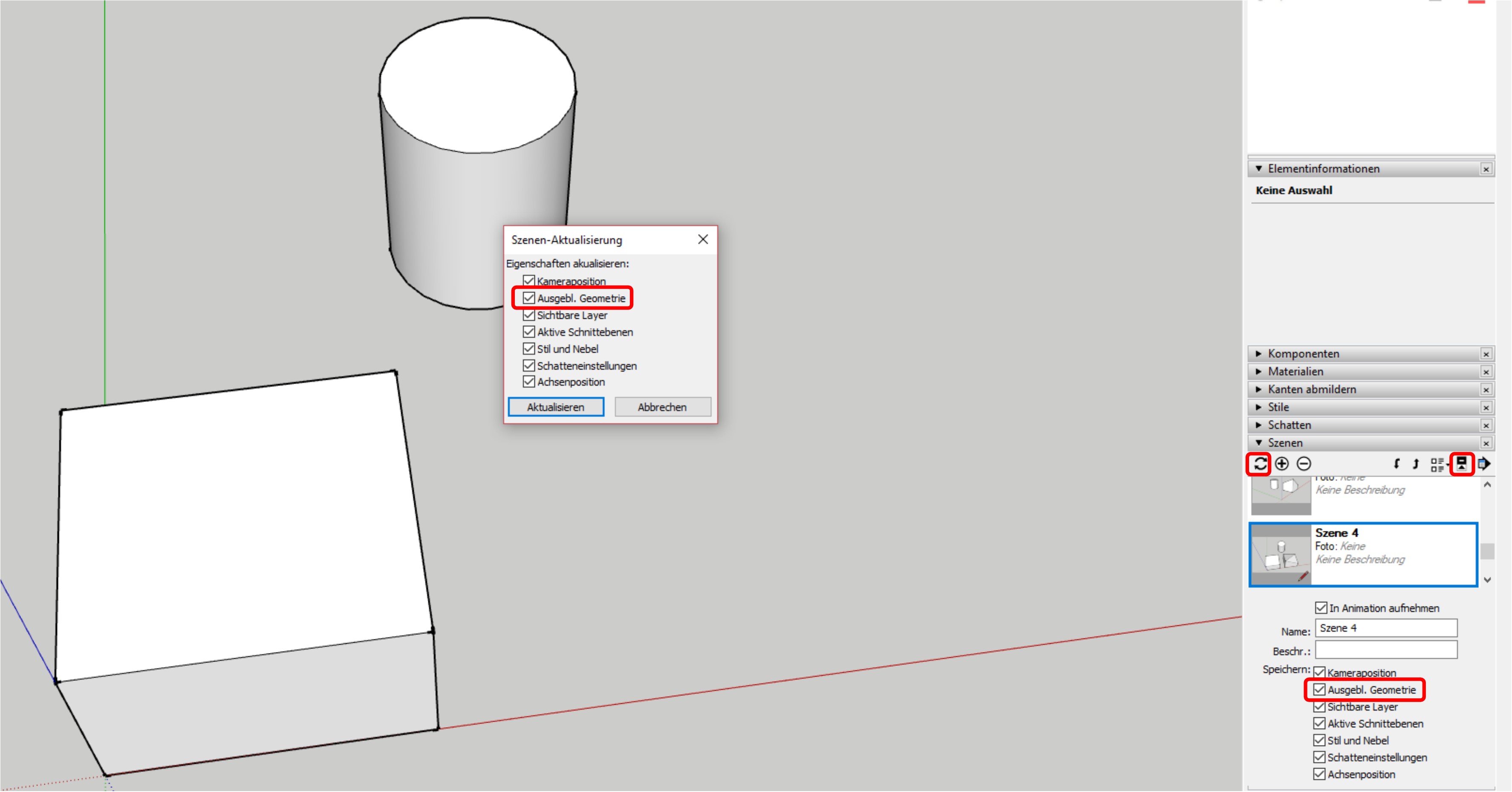 Wenn du eine Szene veränderst und danach die Szene durch anwählen des Doppelkreispfeil-Symbol aktualisierst, erscheint das Pop-Up-Fenster >Szenen-Aktualisierung< hier nun auch darauf achten, dass >ausgeblendete Geometrie< aktiv ist.