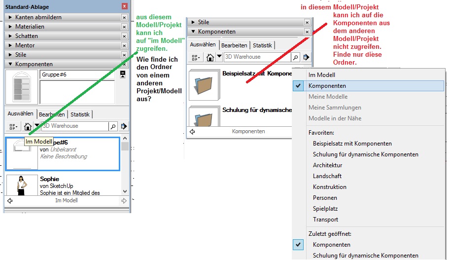 Dementsprechend kann ich die in dem einen Projekt/Modell angelegten Komponenten aus einem anderen Modell/Projekt heraus nicht finden und nicht benutzen. Habe mit der Windows-Suchfunktion schon alle Verzeichniss durchsucht um zumindes den Ordner "im Modell" zu finden. Wahrscheinlich ist es zu einfach, aber es hilft nichts, ich komme nicht weiter.