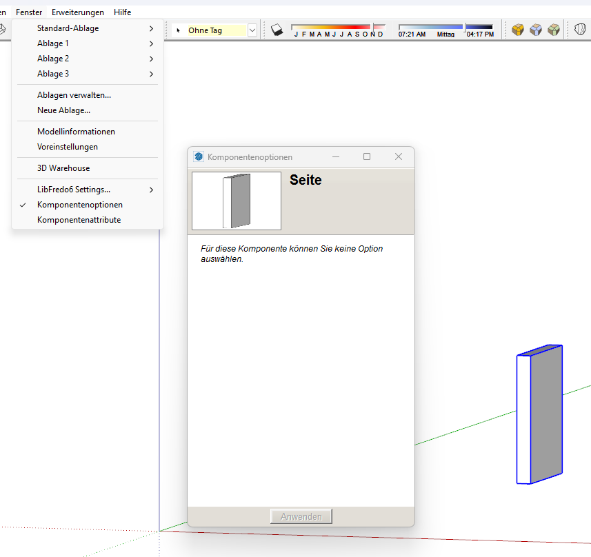 Bei mir taucht das Regal oder die Seite in dem Optionenfenster trotz ausgewählter Komponente nicht wie bei dir auf, stattdessen kommt der Hinweis "Keine Komponenten ausgewählt".