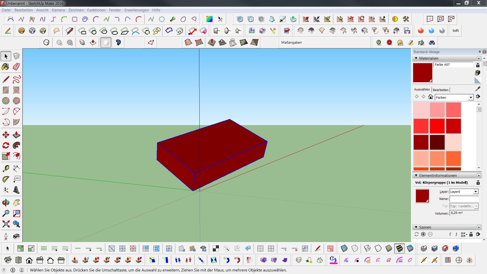 Normalerweise würde ich auch das Rotieren-Werkzeug nehmen. Aber wenn das ganze Modell schief in zwei Richtungen angelegt wurde und die Schieflage nur sehr geringfügig ist und ausserdem das Modell flächenmäßig sehr groß ist, ist das eine richtige Fummelei es genau auf die Null-Line (oder sagt man besser Null-Ebene?) zu bekommen. Siehe Screenshot als Beispiel - in Wirklichkeit ist es ein großes Geländemodell mit unterschiedlichen Höhen und Tiefen (Sandkistenanwendung) und vielen Gebäuden usw., da weiß man gar nicht, wo man das Rotieren-Werkzeug ansetzen soll, weil ja - anders als bei der Box im Screenshot - keine gut sichtbare Anfassfläche da ist. Ich dachte, es gibt vielleicht ein Kommando mit dem man kurz und bündig das komplette Modell auf eine waagerechte Ebene zwingen kann.