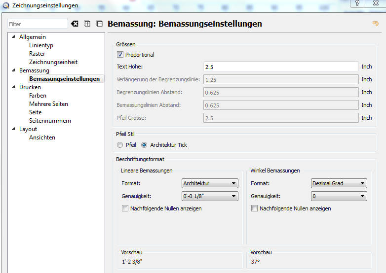 Die Bemassungs-Einstellungen wie z.B. die Darstellung der Mass-/Masshilfslinien sind fest verdrahtet und nicht benutzerdefinierbar.