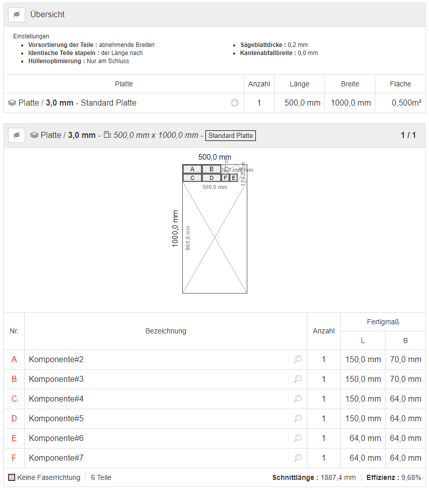 Damit die Schnittlinienlänge möglichst kurz bleibt, sollen Plattenkanten aneinander liegen. Dabei soll die Schnittbreite (0,2mm) berücksichtigt werden.