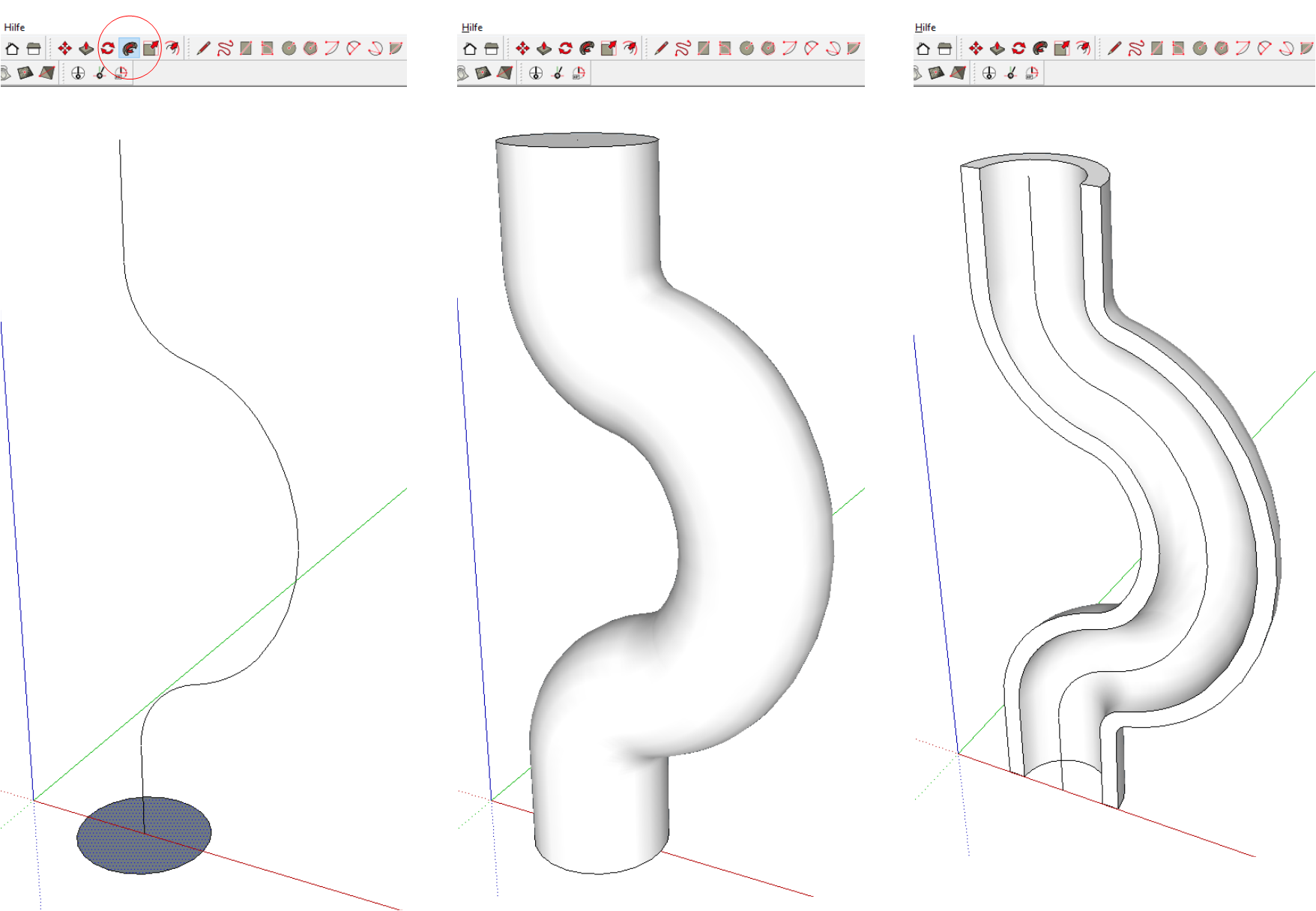 * Warum erhalte ich trotz geschlossener Fläche beim dritten Element dieses kaputte Objekt? Warum bei gleicher Vorgehensweise mit dem selben Pfad, aber Kreis als geschlossene Fläche, bereits beim zweiten Element?
