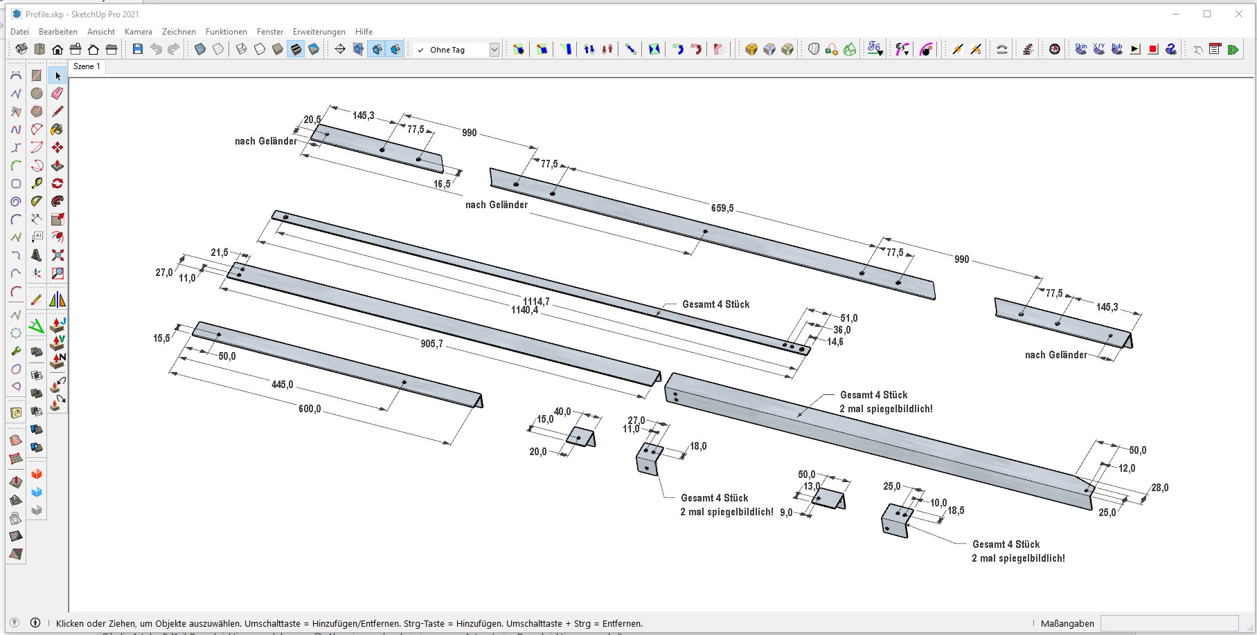 Ich habe 1 Oberteil, 1 Unterteil und zwei Seitenteile, zusammengenagelt ergeben die Teile 1 Rahmen (Bienenrähmchen). Wie erstellt man daraus eine Einzelteilzeichnung 2D oder 3D mit Bemassung?