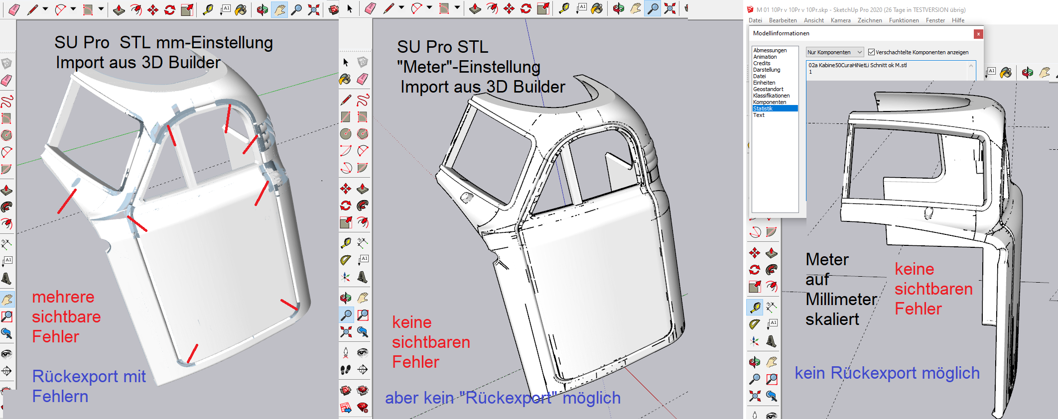 Es geht jetzt um eine STL von Original ca. 40 MB, mit mm-Einstellung (ca. 30 x 50 x 80 mm grosses Karosserieteil) die beim importieren in SU Pro fehlerhaft wird.
