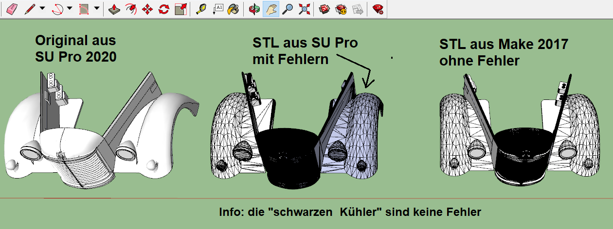 Gravierender ist aber, dass SU Pro  - im Gegensatz zu SU Make - fehlerhafte STLs erzeugt. Da ich als Hobby-Modellbauer mit 3D Drucker sehr viel mit STLs arbeite, wäre das leider ein k.o.-Kriterium. Ist dieser Fehler bekannt oder hat den sonst schon jemand gehabt? Hat jemand einen Tipp?