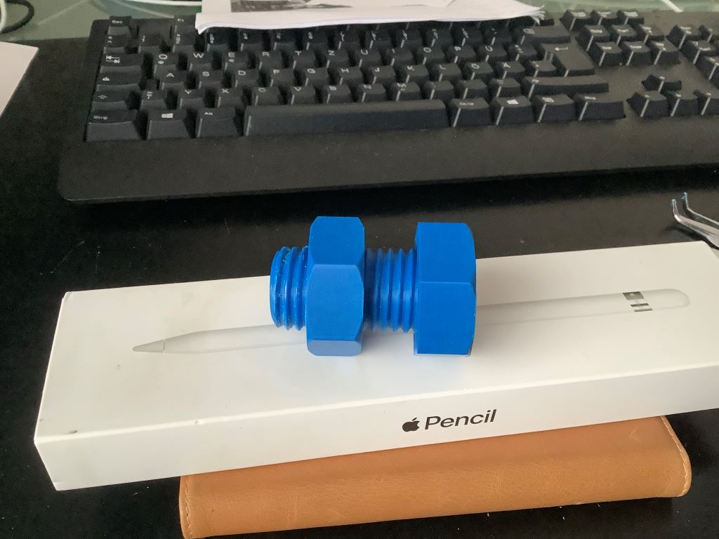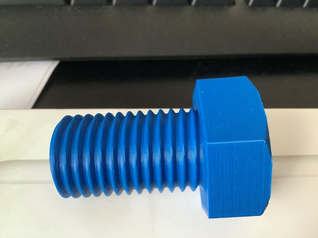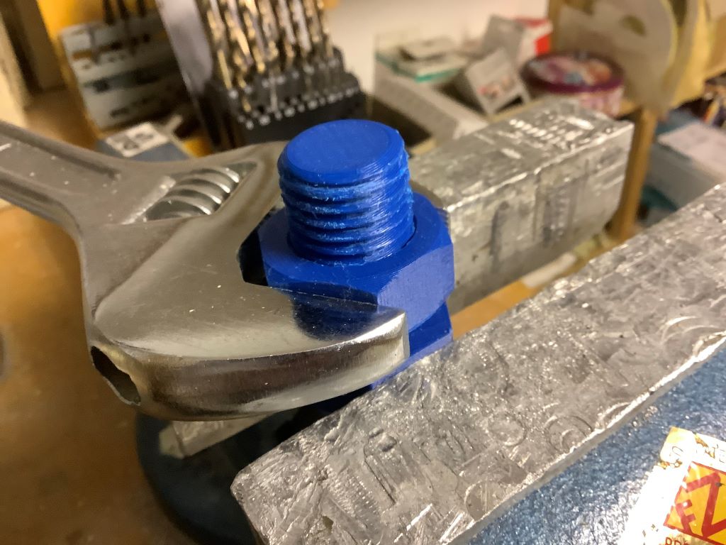 Das eigentliche Problemchen ist meiner Meinung nach. Beim drucken werden Stützungen in die Gewindegänge der Mutter gedruckt, damit die vorstehenden Gewindewangen beim drucken halt haben. Diese kann man mit einer kleinen Spitzzange nach dem Druck herausreißen. Bei dieser Prozedur war ich nicht sehr sorgfältig und Reste der Stützungen waren noch im Gewinde. Ich hätte noch mit einem spitzen Nagel durch die Gewindegänge den Rest auskratzen sollen. Von Hand konnte ich ein drittel der Schraube aufdrehen. Das ging dann immer schwerer, sodass ich den Engländer zu Hilfe nehmen musste.