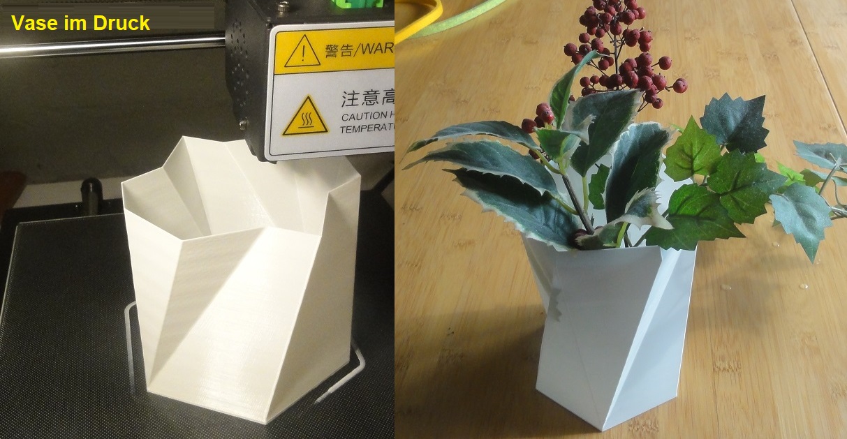 Hier die noch im Druck befindliche Vase aus Sketchup. Man sieht bereits, dass es nur eine scheinbare Spiralvase ist (wie von Jörg erwähnt), man sieht aber auch, dass der Druck sehr sauber verläuft, speziell was die "papierdünnen Wände" betrifft und dass das "Zusammenspiel" zwischen Sketchup und der Slicersoftware "Cura" gut funktioniert. Cura muss übrigens in den "Spiralmodus" versetzt werden, damit die Vase "oben offen" gedruckt wird (sonst wäre ein Deckel drauf).