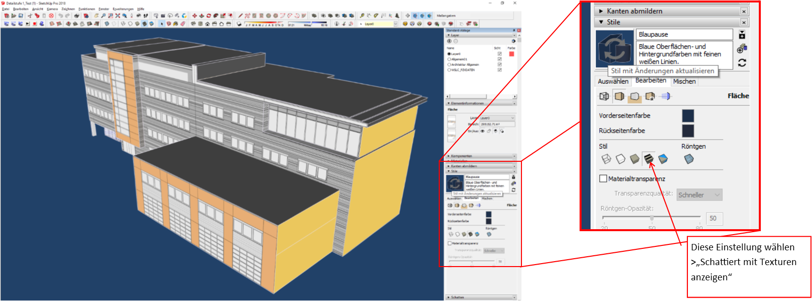 Somit kommt es auf die detaillierte Stileinstellung an. Wenn in einem ein Stil (z.B. Blaupause) die Modell-Darstellung «Monochrom» eingestellt ist, werden keine Texturen dargestellt. Du kannst jederzeit den Stil anpassen und die Darstellung «Schattiert mit Texturen anzeigen» aktivieren. Jetzt werden die Texturen dargestellt und in deinem Fall die Fassaden wie gewünscht dargestellt.