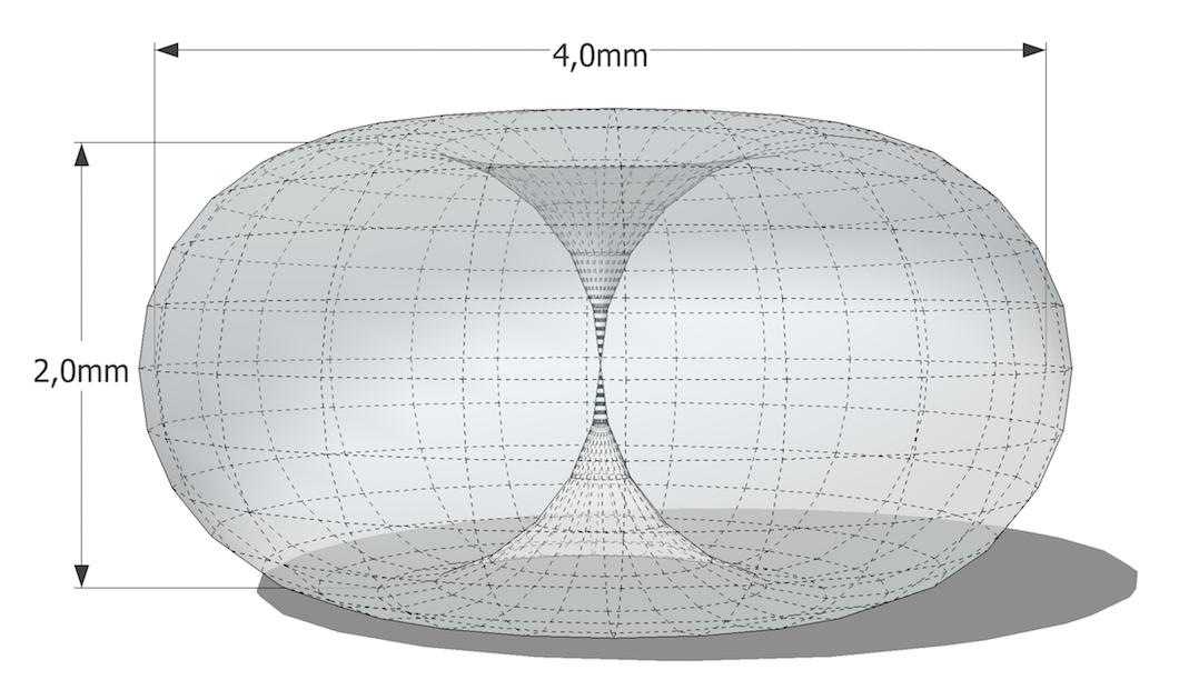 1 cm Radius des Querschnitts-Kreises, also insgesammt 4 cm breit und 2 cm hoch.