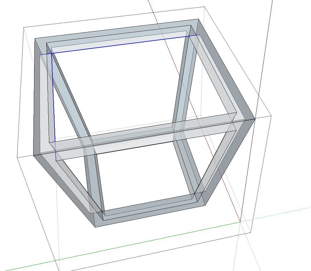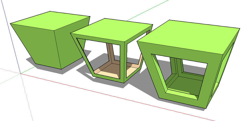 Aus einem konstruierten Trapez (ich habe einfach die Ecken zweier übereinanderliegender und unterschiedlich großer Quadrate verbunden) möchte ich an allen vier Seiten jeweils ein Trapez und am Boden ein Quadrat ausschneiden, so dass eine Art Gitterstruktur in Trapezform entsteht.