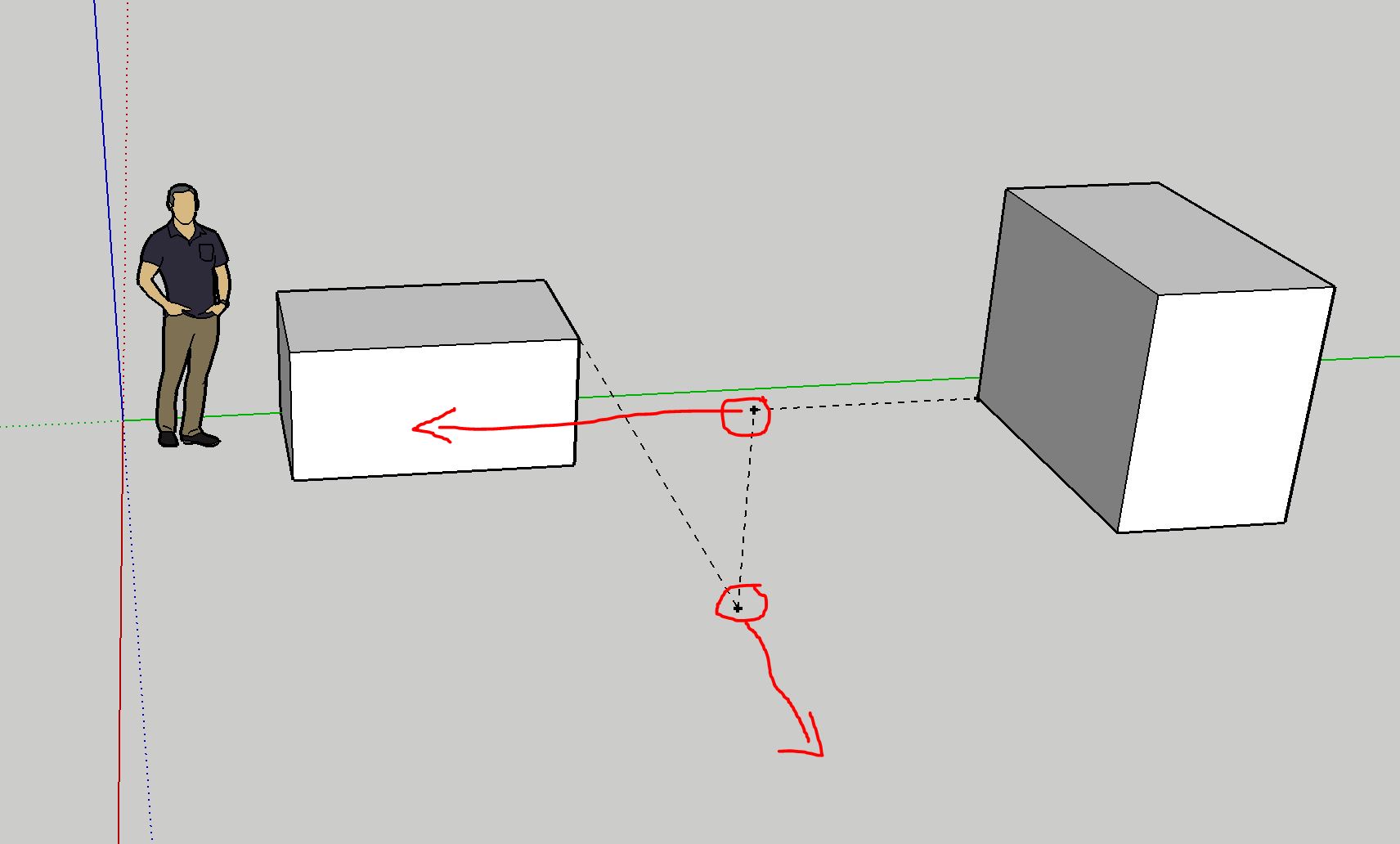 Ich kriege aber somit ja Schnittkante (Rechtwinklig immer zum Objekt) von den auf deinem Bild der zwei grünen Punkte hin? Die eine Linie vom linken Objekt zum rechten Objekt ist ja schräg. (Sorry, wenn ich mich etwas unpräzise ausdrucke. Ansosnten könnte ich es anhand eines anderen Beispiels versuchen)