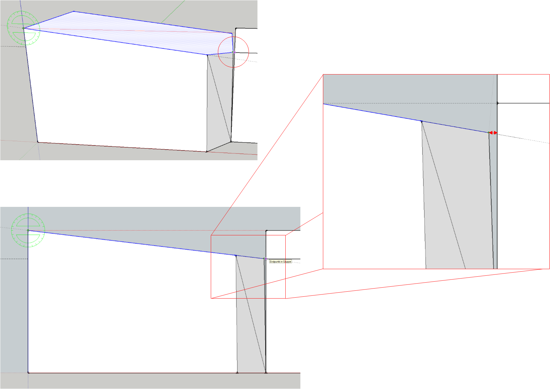 Nun will ich das Dach etwas neigen. Ich habe versucht ein paar Linien auf der niedrigeren seite zu markieren und herunter zu verschieben. Hat aber leider nicht geklappt. Das verschiebt sich irgendwie nur in der grünen Achse. Habe auch versucht mit einer anderen Kameraansicht zu verschieben.