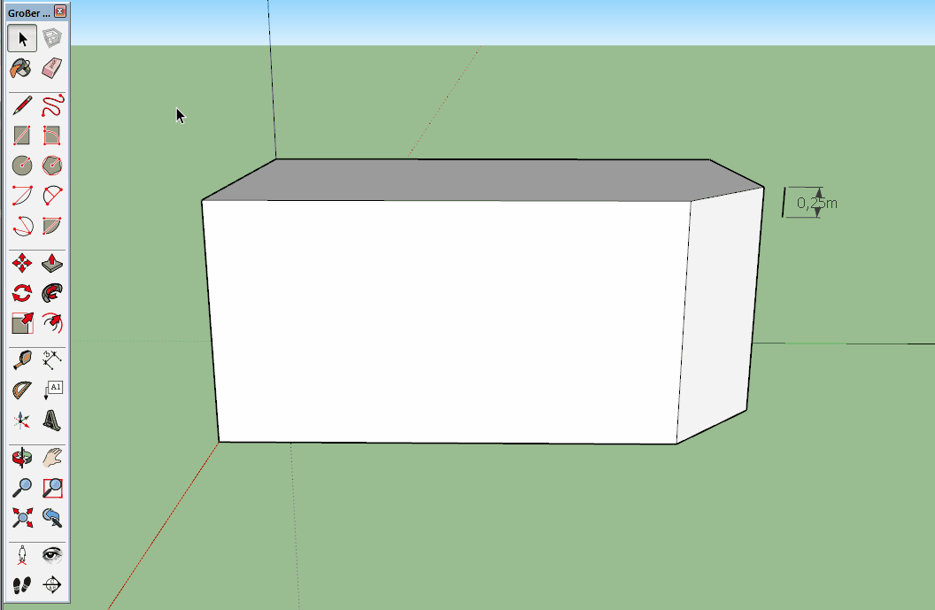Nun will ich das Dach etwas neigen. Ich habe versucht ein paar Linien auf der niedrigeren seite zu markieren und herunter zu verschieben. Hat aber leider nicht geklappt. Das verschiebt sich irgendwie nur in der grünen Achse. Habe auch versucht mit einer anderen Kameraansicht zu verschieben.